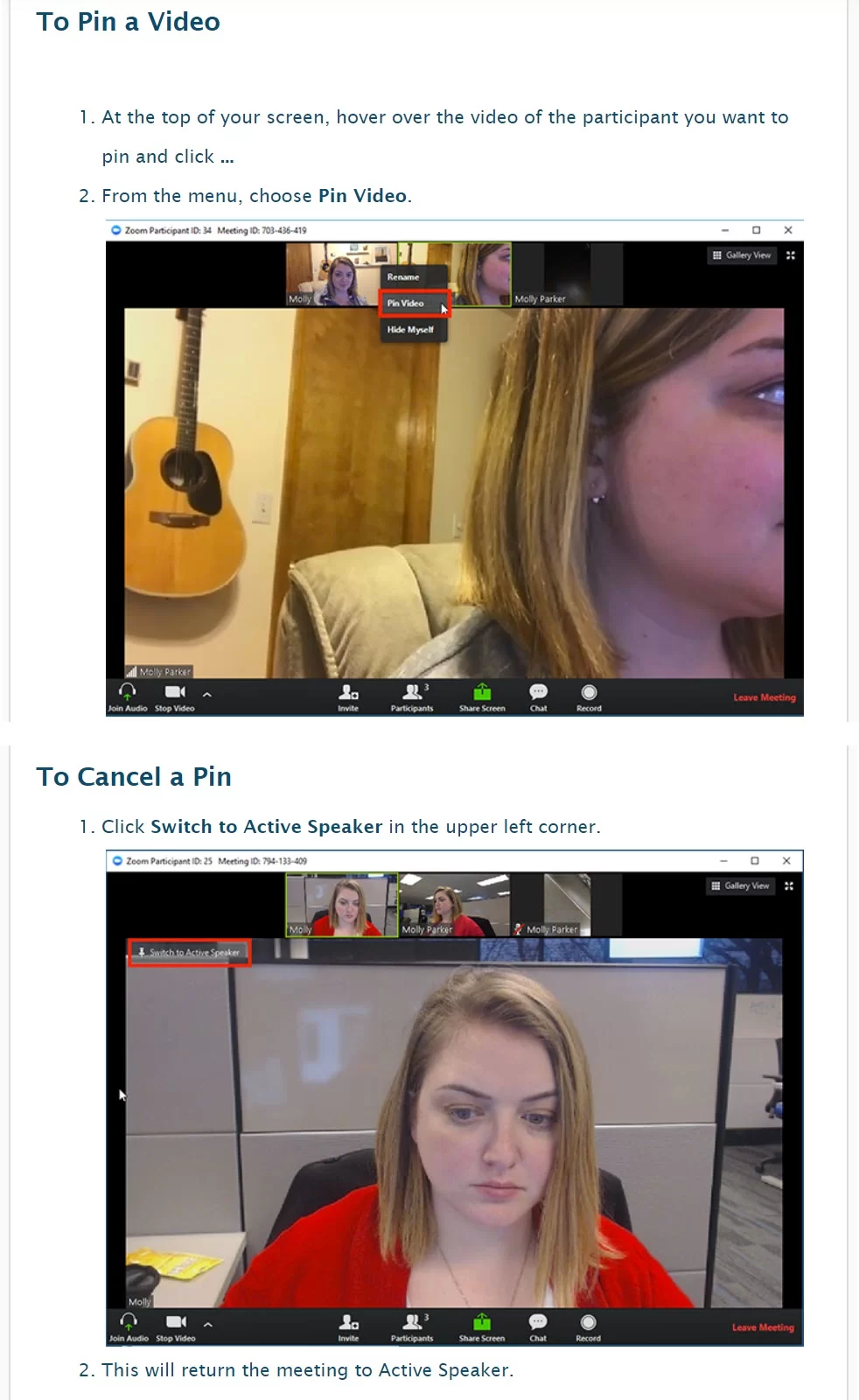 Images taken from zoom online help: https://support.zoom.us/hc/en-us/articles/201362743-Pin-Video
